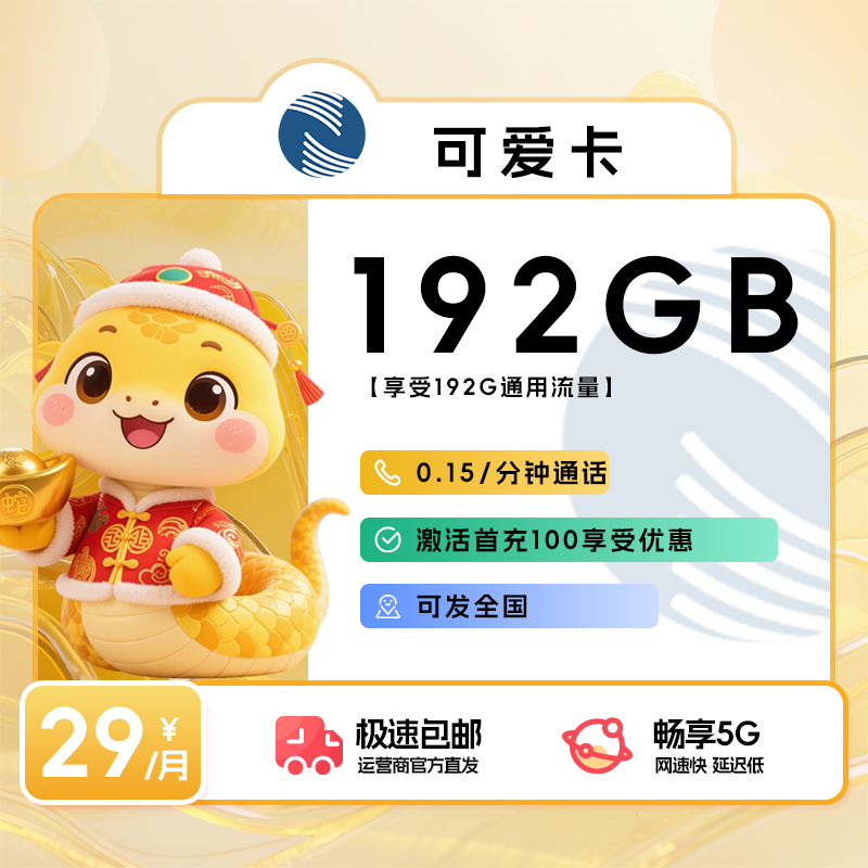 29元包192G通用流量+通话0.15元/分钟(参加再充有礼活动可升级5年套餐)
