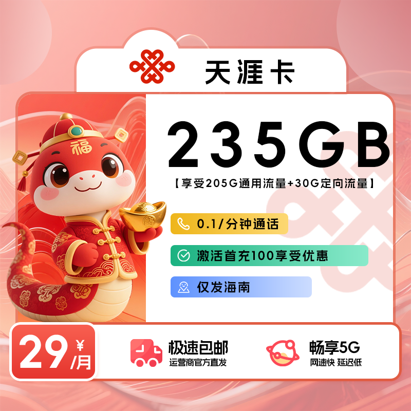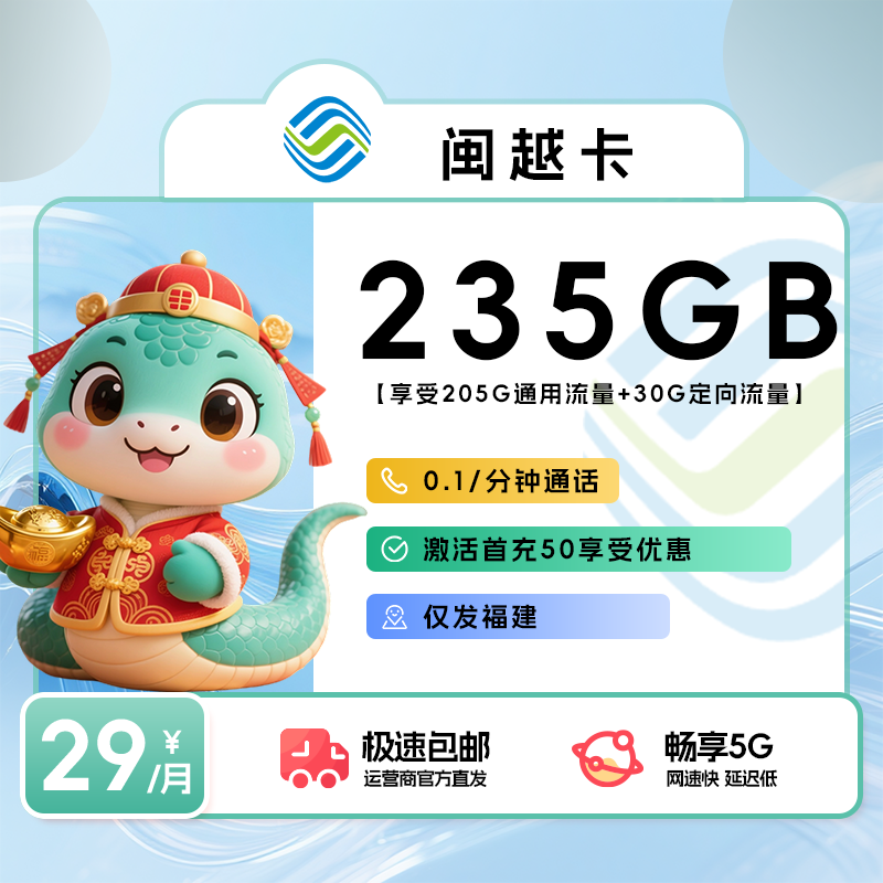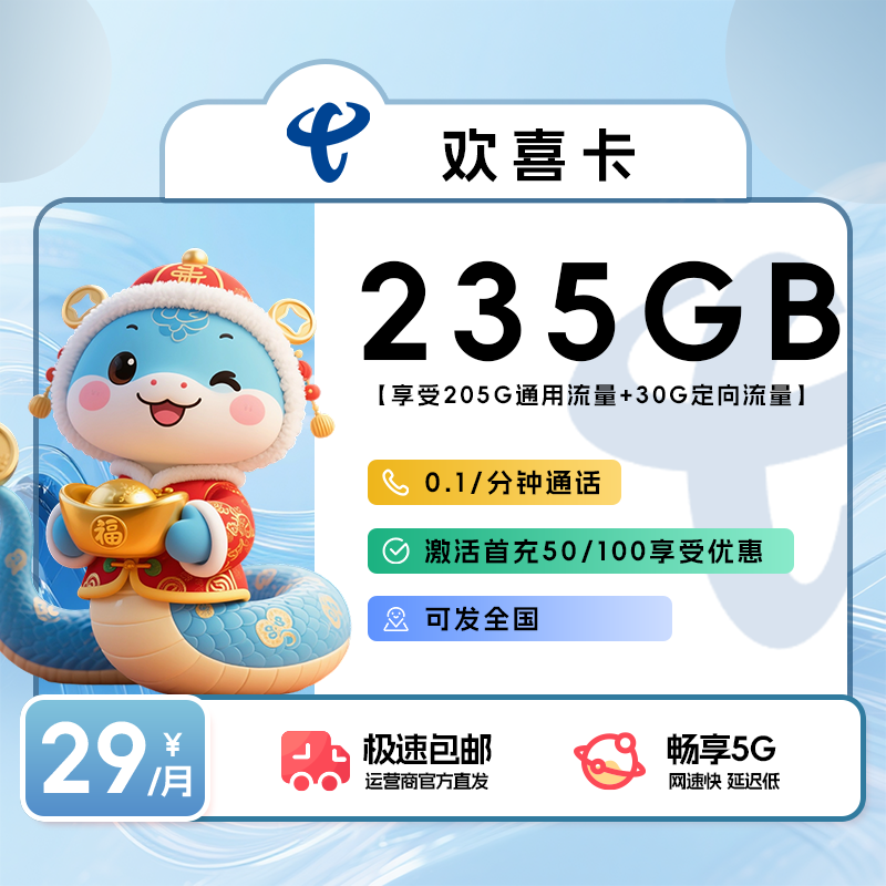 29元包205G通用流量+30G定向+通话0.1元/分钟