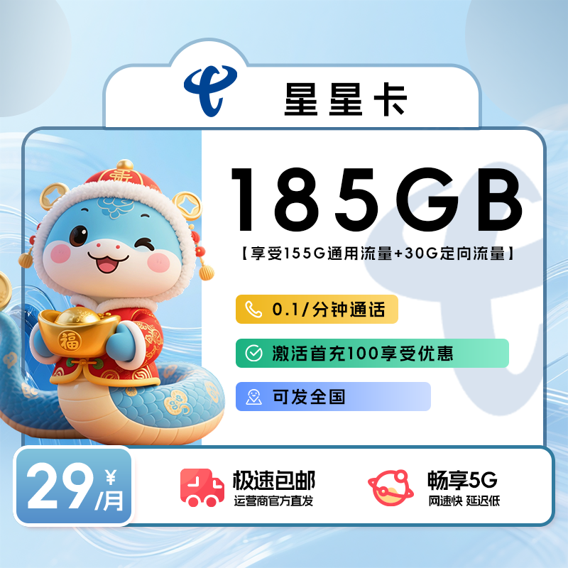 29元包155G通用流量(其中105G通用流量次月月底叠加)+30G定向+通话0.1元/分钟